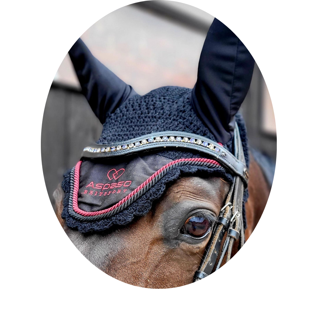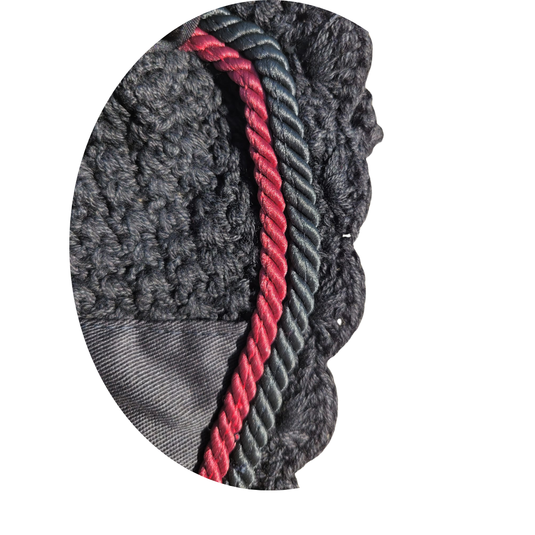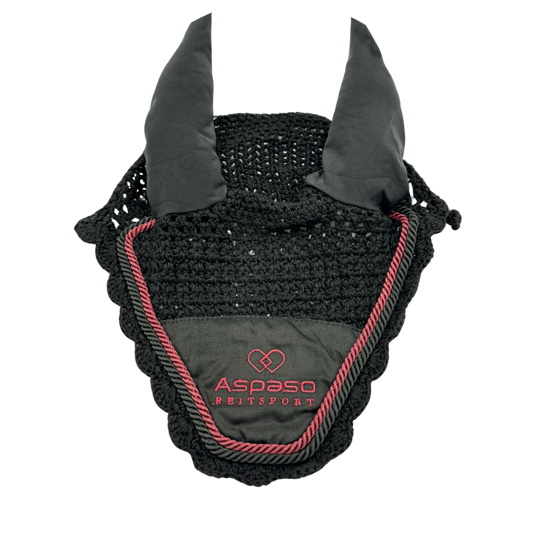 Wunderschöne handgehäkelte schwarze Fliegenmütze mit abgesetzter bordeauxfarbende und schwarzer Kordel. Diese Fliegenmütze besteht aus Baumwolle und besitzt elastische Ohren für eine optimale Passform. Auf der Vorderseite befindet sich ein gestickter Aspaso Schriftzug. Erhältlich in 3 verschiedenen Größen = Pony, Cob, Full